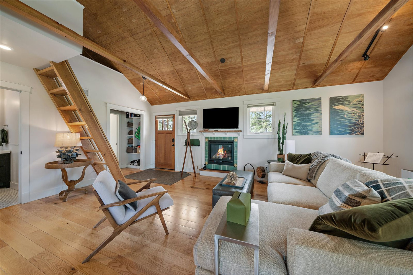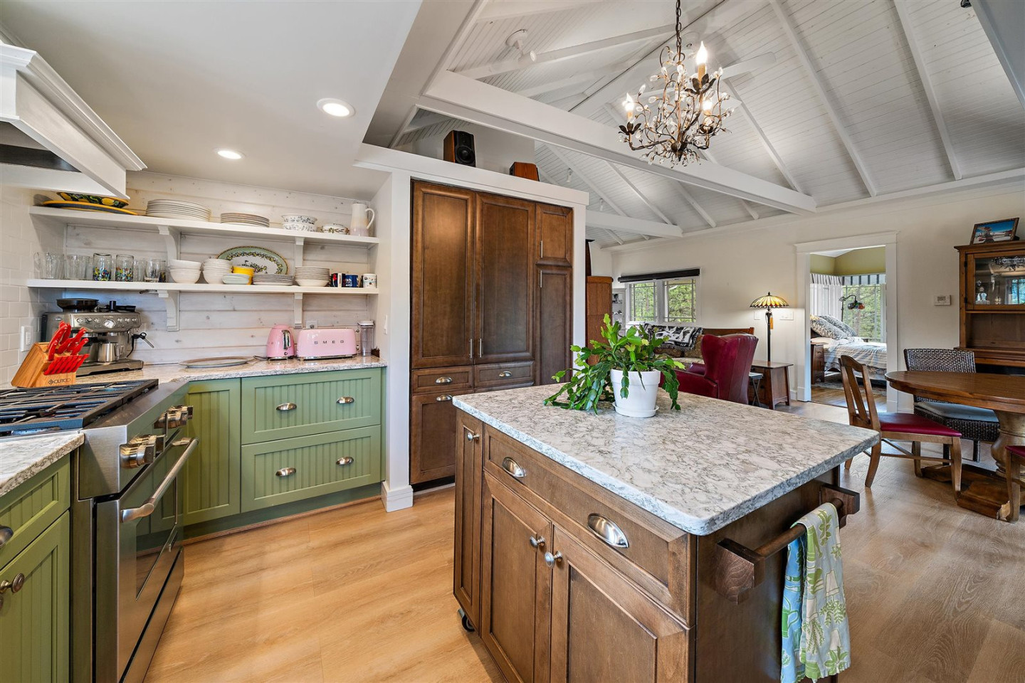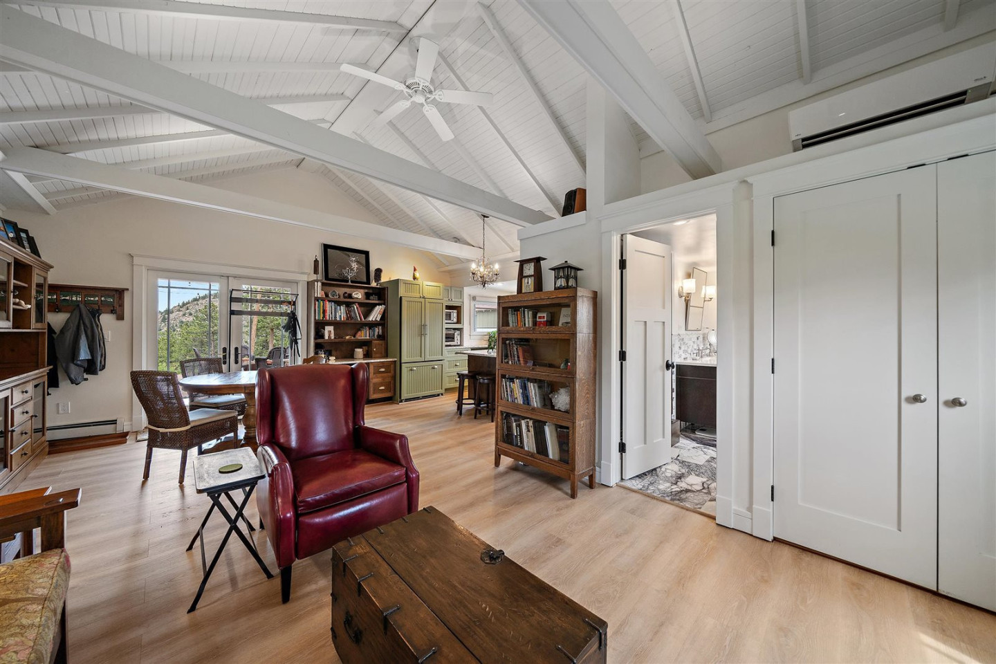 Originally the 1941 caretaker’s home, now a fully renovated one-bedroom residence (1,204 sq ft) with central A/C, modern finishes, Pella windows, and a heated 3-car garage with loft.